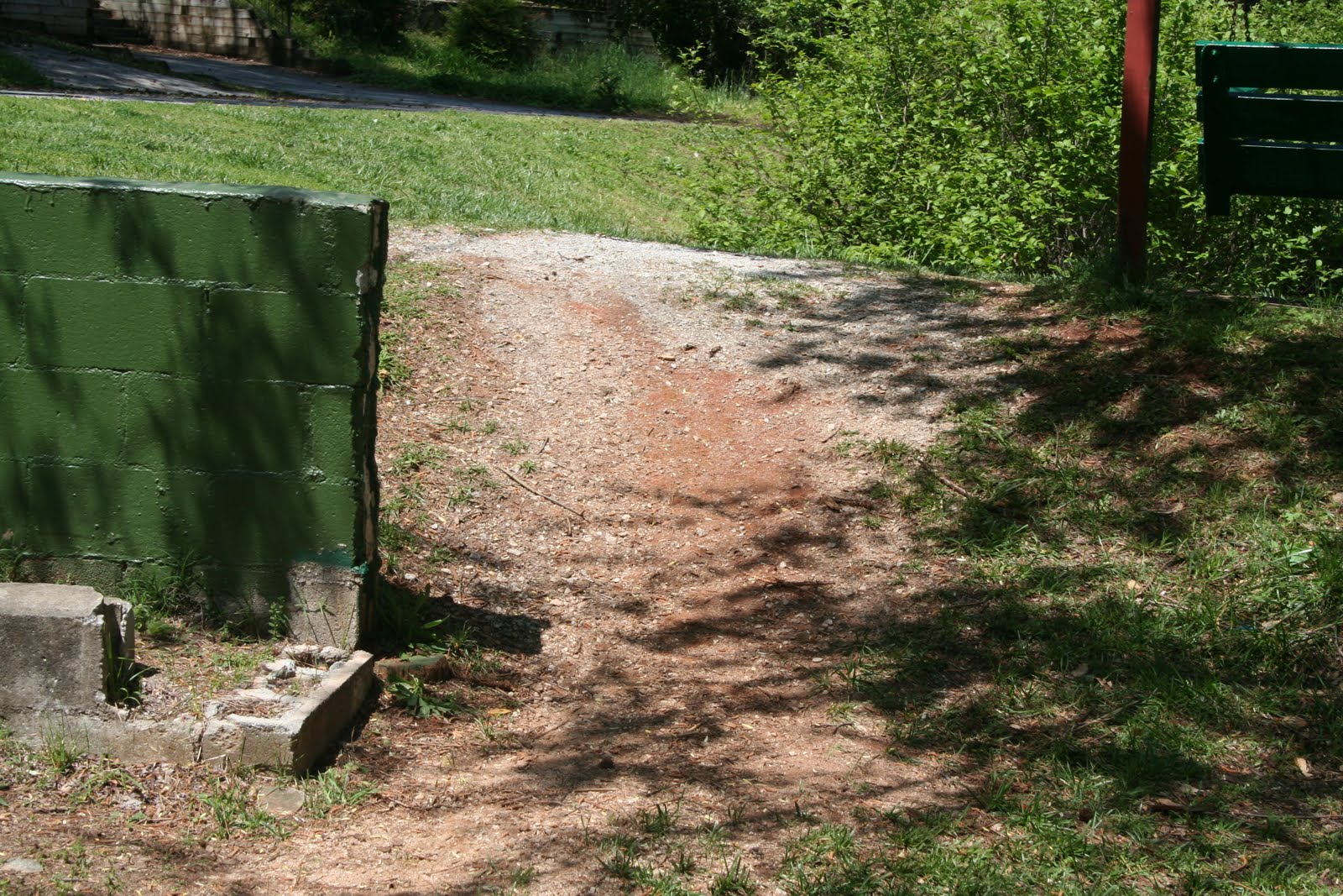 It's also possible to reach the playground by scrambling down an earthen bank beside the green bench that sits about five feet out on the berm.